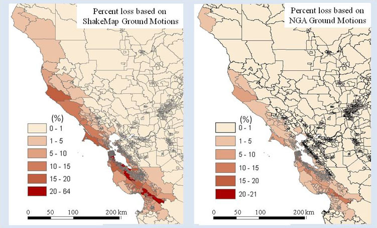 figure 1, for example). One can expect that NGA models could lead to substantial differences in estimated losses and related effects than those derived from earlier GMPEs. Our analyses show that the estimated losses for the UCERF 2-based scenarios are 28% – 63% lower than those for the comparable