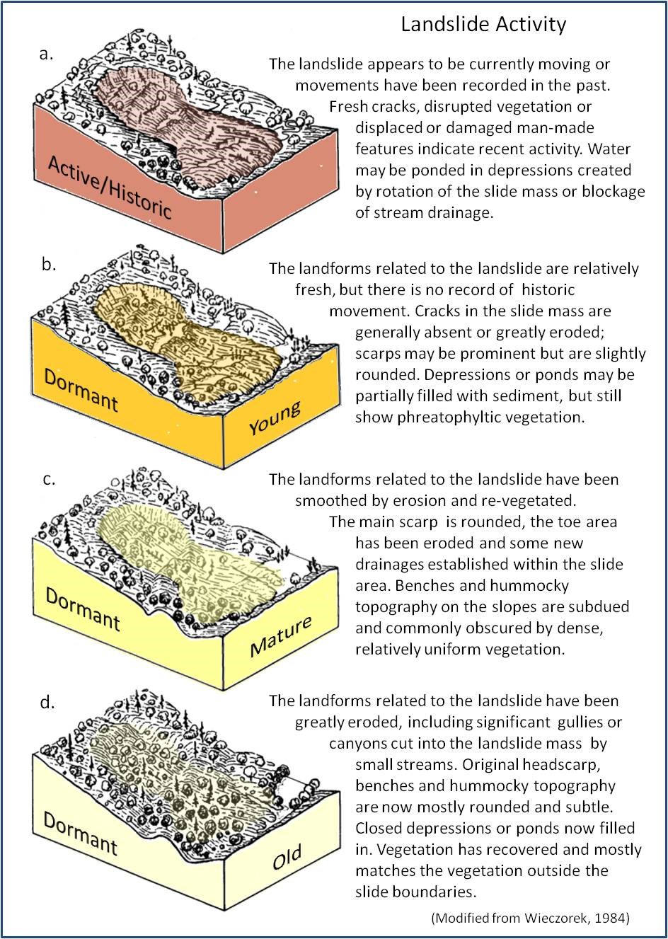 Each landslide is classified based on the recency of activity into one of four categories based on the system of Keaton and DeGraff, (1996). The landslide activity categories are graphically portrayed with the colors used to delineate landslide activity on the maps. The designation of activity shows an estimate of how recently the landslide moved, but also suggests the type of hazard represented. More recently active landslides are more likely to continue to fail, or to fail completely. Older landslides are less likely to move as single slide masses, but may be the source of smaller slides.