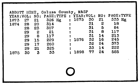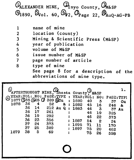 Index to Articles on California Mines in the MINING AND SCIENTIFIC PRESS, volume 1, 1860 through volume 124, March 1922. This unique index which was created as a Works Progress Administration project sponsored by the then Division of Mines of the Department of Natural Resources between 1935 and 1938 was loaned to the Foundation by the Library of the Division of Mines and Geology for purposes of preservation microfilming. We are grateful to Mr. Perry Amimoto, Geologic Information Officer and Ms. Angela Brunton, Senior Librarian, Division of Mines and Geology, Department of Conservation for their cooperation.