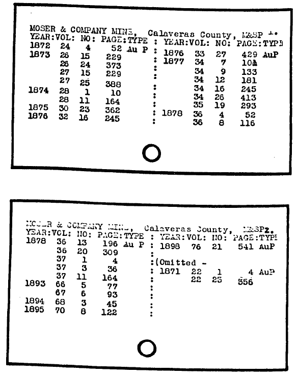 This index was compiled in the mid-1930s as a card catalog by the Works Progress Administration (WPA) for the California Division of Mines and Geology. The card catalog contains more than 22,000 individual cards indexing articles related to California mines in the journal. In 1986, the California State Library Foundation copied the card catalog to microfiche. The microfiche have now been scanned to digital (pdf) files and which are