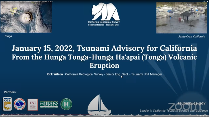 During an event like the Tonga tsunami, there are a series of hourly communiques between the California Tsunami Program (CTP) and the National Tsunami Warning Center (NTWC). The CTP members then hold online meetings with officials from cities, counties, and ports and harbors to help relay the information about the tsunami forecasts and provide information on the likely impacts for California.